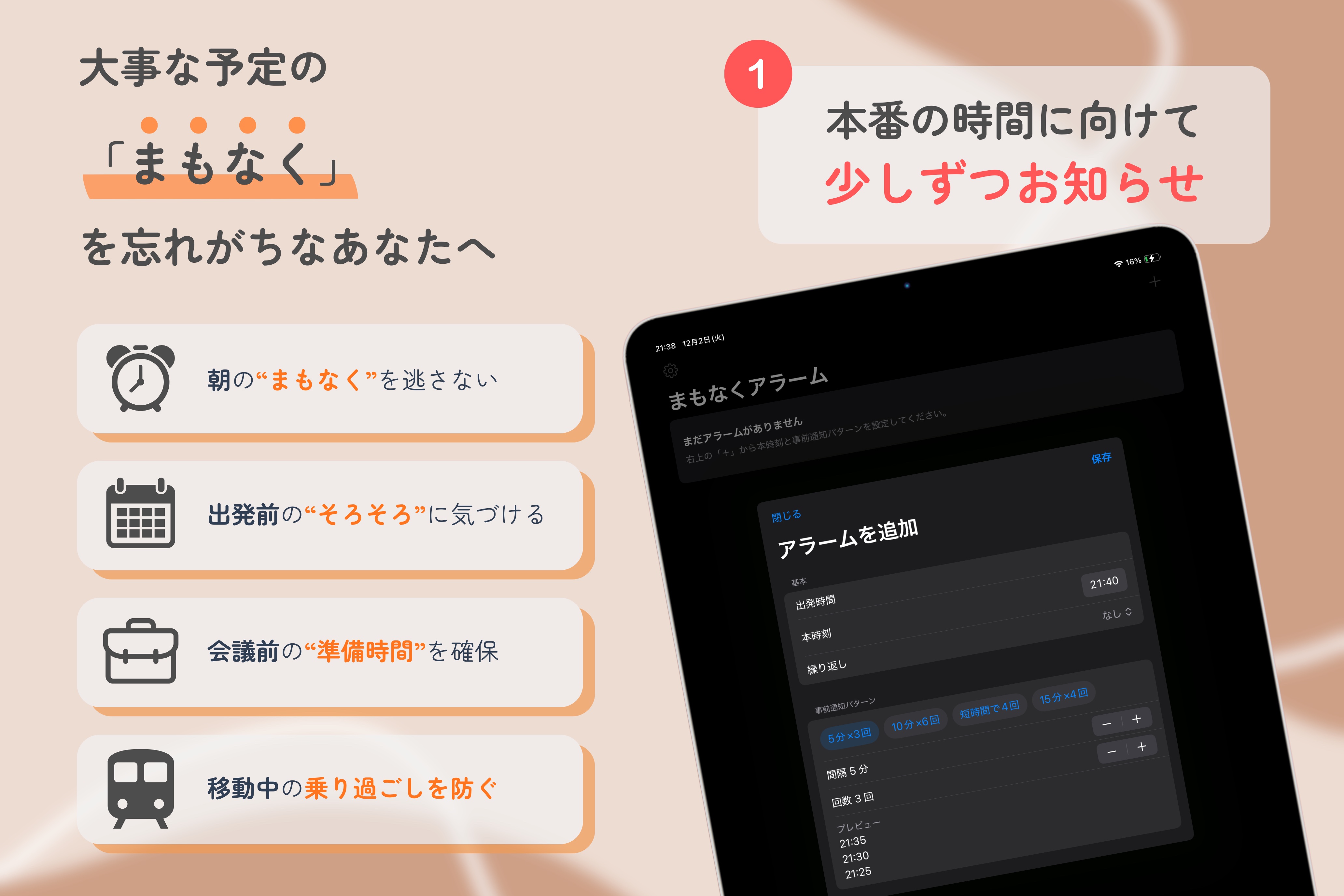 本番の時間に向けて、徐々に気づかせてくれるアラームアプリ